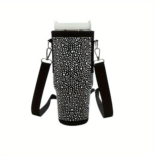 A bottle carrying bag suitable, featuring shiny stones, with a adjustable shoulder strap