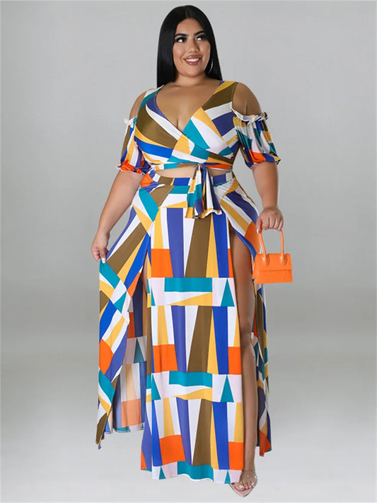 Plus Size Dress Sets Two Piece V Neck Printed Crop Top Big Swing Skirts