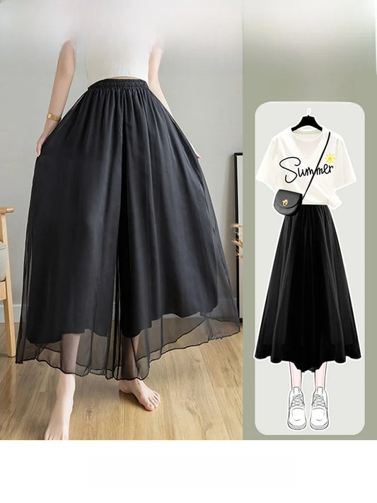 Plus Size Women's Elastic High Waist Wide Leg Pants Skirt Loose Fabric Chiffon