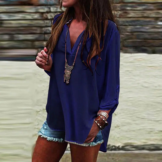 Plus Size V-Neck Long Sleeve Zip Chiffon Shirt