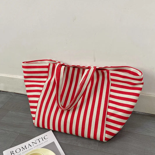 Large Capacity Canvas Shoulder Bag Simple Striped Tote Bag