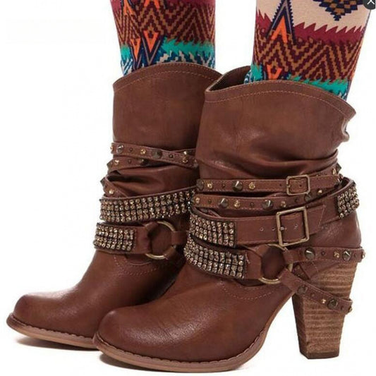 Women's Waterproof Studded Short Boots with Chunky Heels