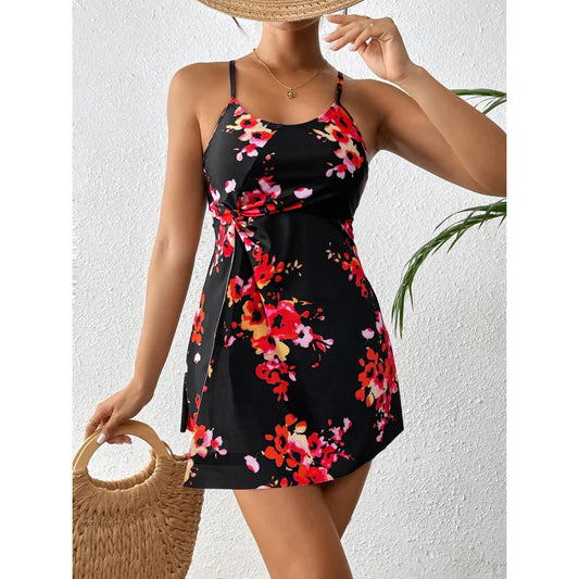 Women's Conservative Strap Dress Style Printed Two-Piece Swimsuit