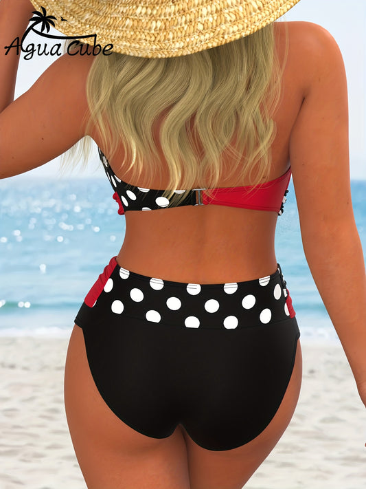 Summer Trend Women's Polka Dot Print Two-Tone Bikini Set for Beach Vacation