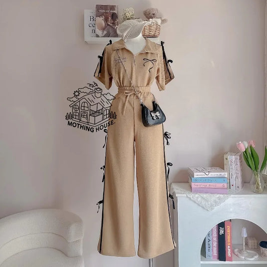 Sweet Suit Women's Bow-tie Printed POLO Shirt Wide-leg Trousers Two-piece Set