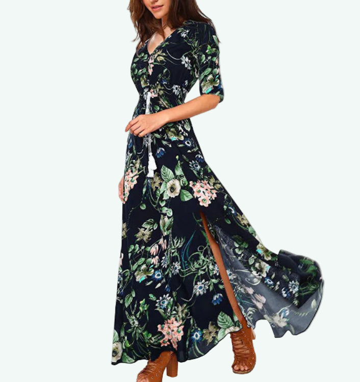 With seven-point sleeves and an elastic waist, this dress is designed for versatility and ease. The single-breasted clothing placket adds a unique detail that sets it apart from ordinary dresses. Pair it with your favorite accessories for a complete boho-chic outfit!