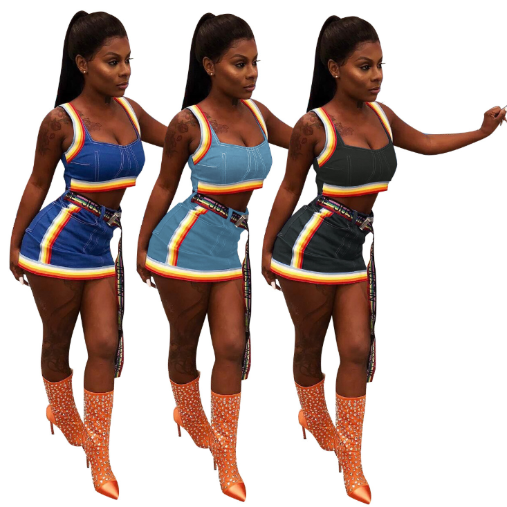 Colorful Striped Denim Skirt and Casual Two-Piece Set