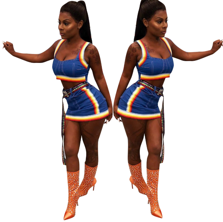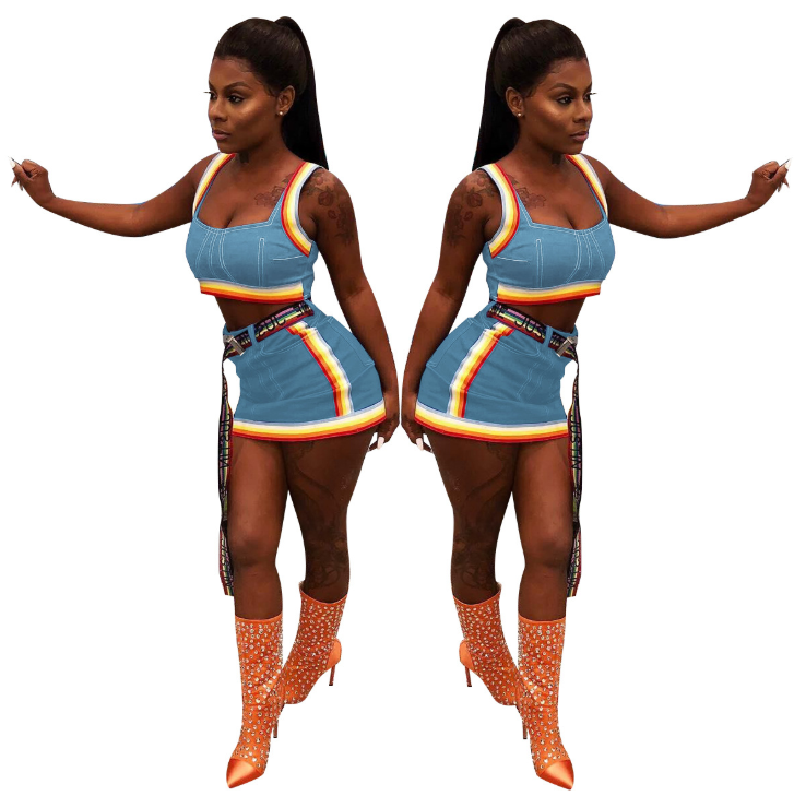 ★★★★★Elevate your casual wardrobe with our stunning Colorful Denim Skirt Set. This chic two-piece ensemble features a trendy sleeveless t-shirt top paired with a stylish bodycon skirt, making it perfect for a variety of occasions. Whether you're headed to a casual outing or a fun weekend getaway, this set ensures you stand out with its solid color design and contemporary 3D pattern elements.