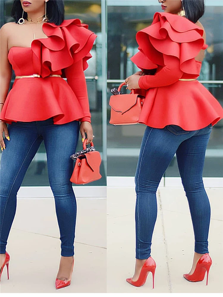★★★★★Discover the ultimate blend of style and sensuality with our stunning long-sleeve blouse. Crafted from high-quality polyester fiber, this chic top offers a slim fit that flatters your figure while ensuring comfort throughout the day. The unique ruffled design and lotus leaf sleeves make it a standout piece for any occasion, whether you're dressing up for a night out or keeping it casual during the day.
