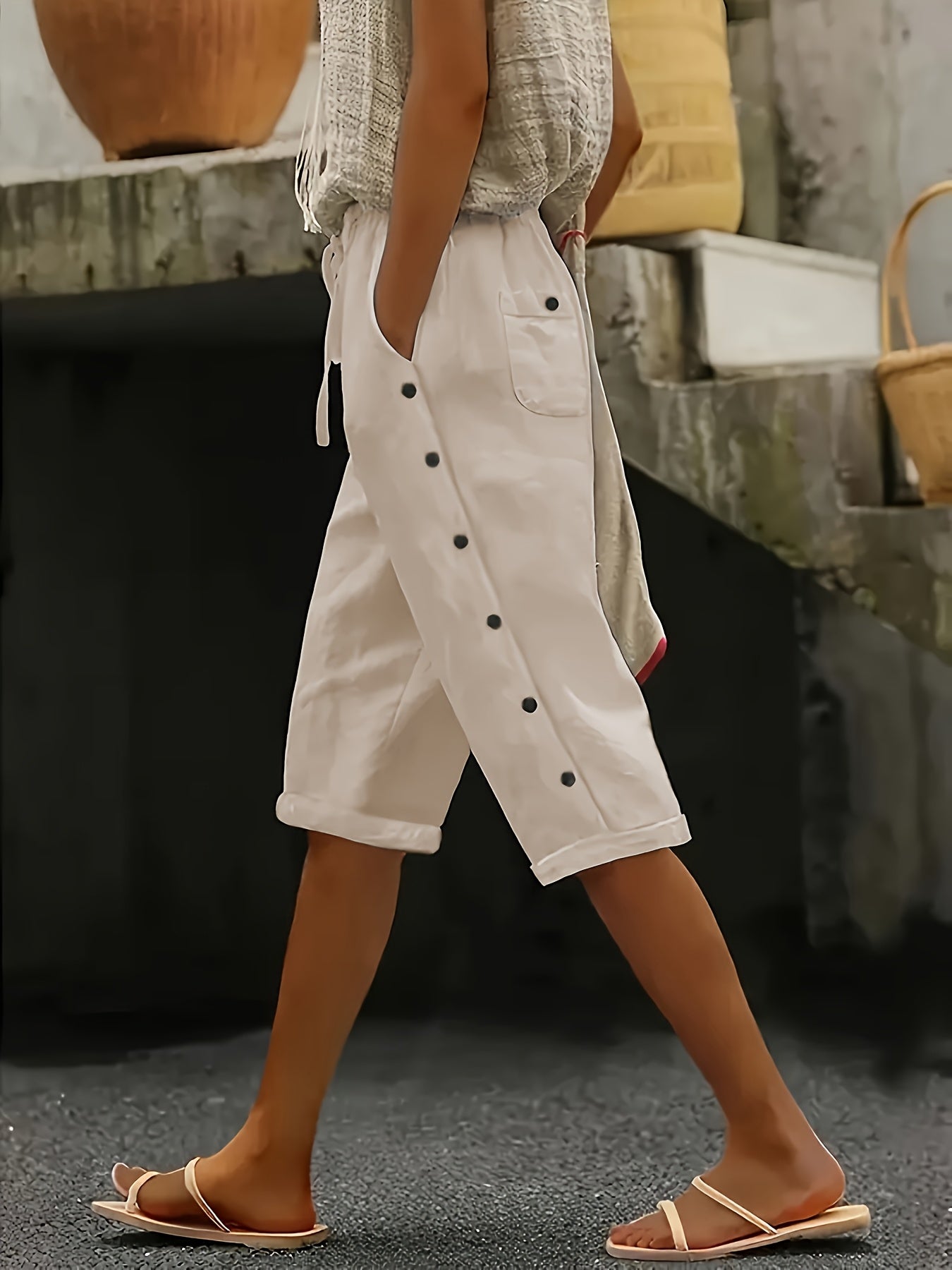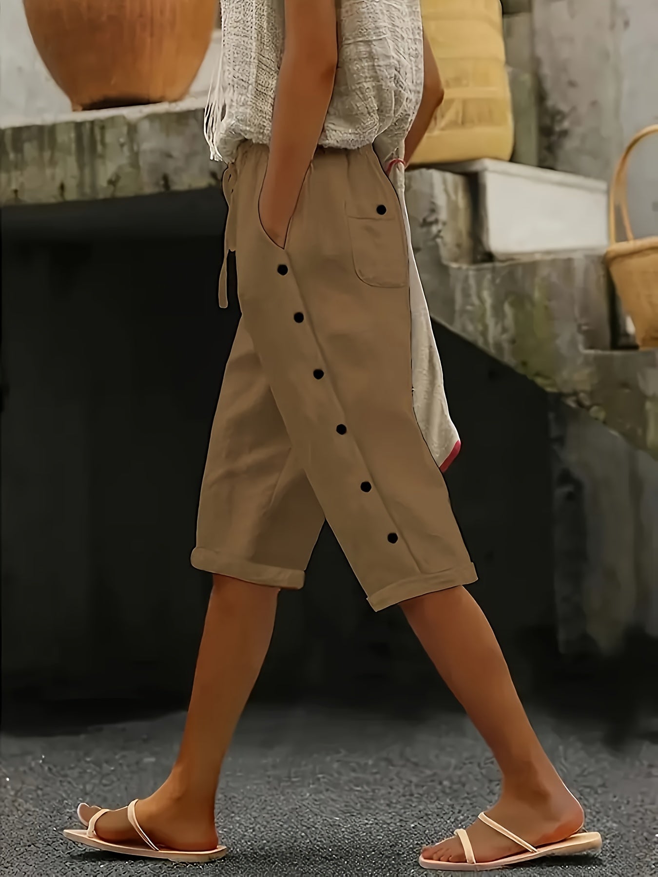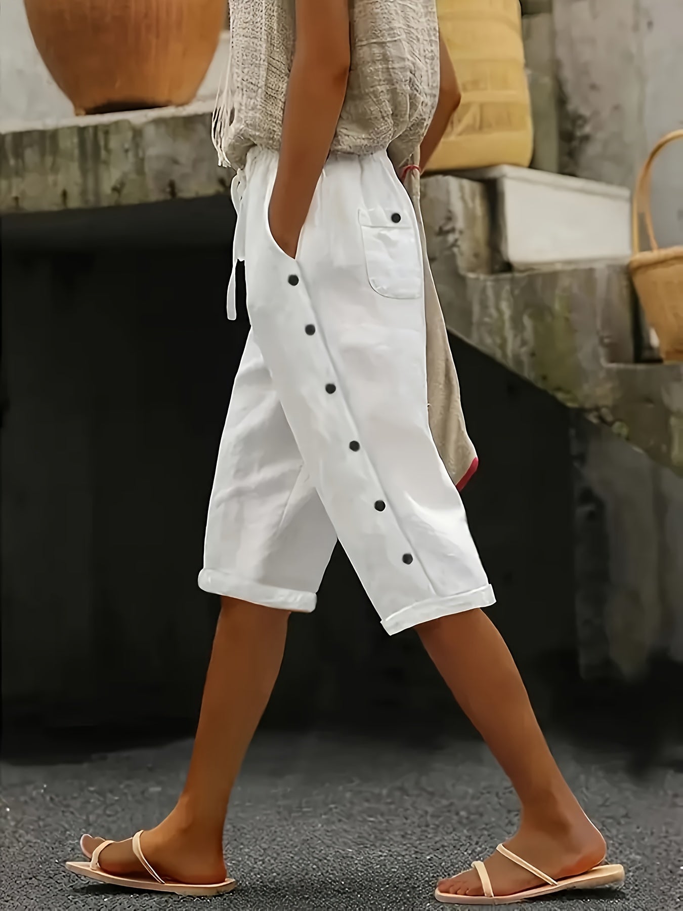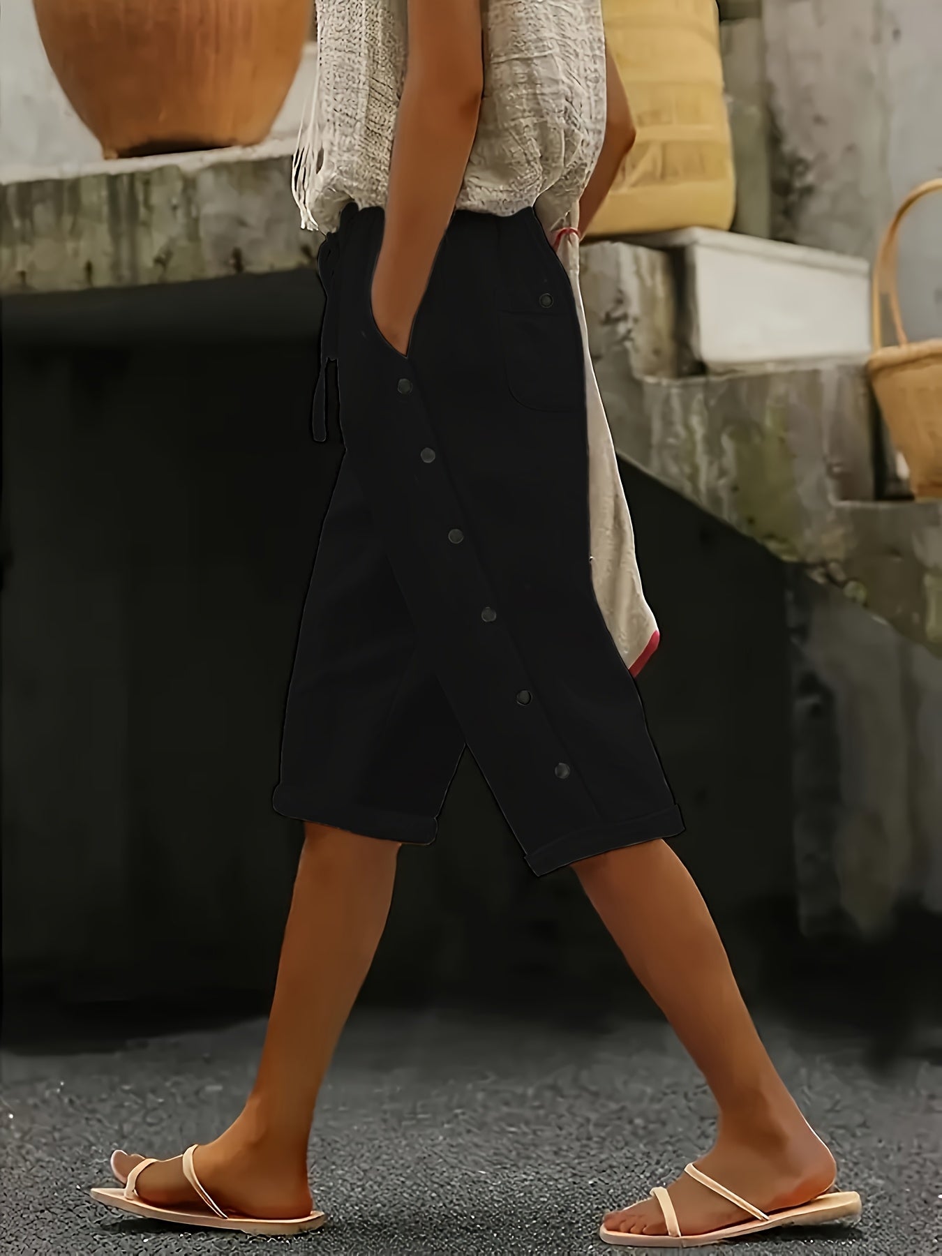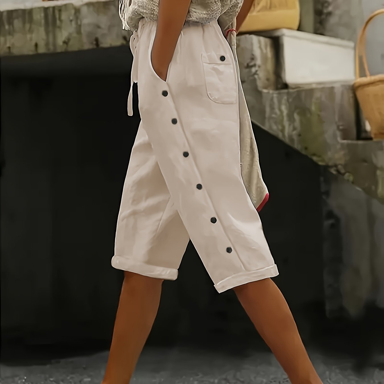 ★★★★★Plus Size - Women's Casual Button Pants with Pockets - Straight-Leg Polyester Blend, Solid Color Elastic Waist, Comfortable All-Season Wear, Elegant Design for Everyday Outfits, Cute Pants, Plus Size