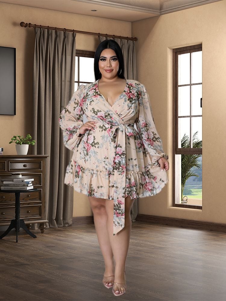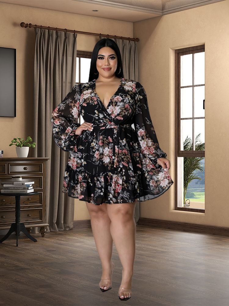 ★★★★★Discover the ultimate blend of style and comfort with our stunning Plus Size Women Flower Print Chiffon V Neck Out Long Sleeve Dress. Designed specifically for the modern woman, this dress combines an elegant A-line skirt with a flattering V-neck to ensure you look fabulous on any occasion.