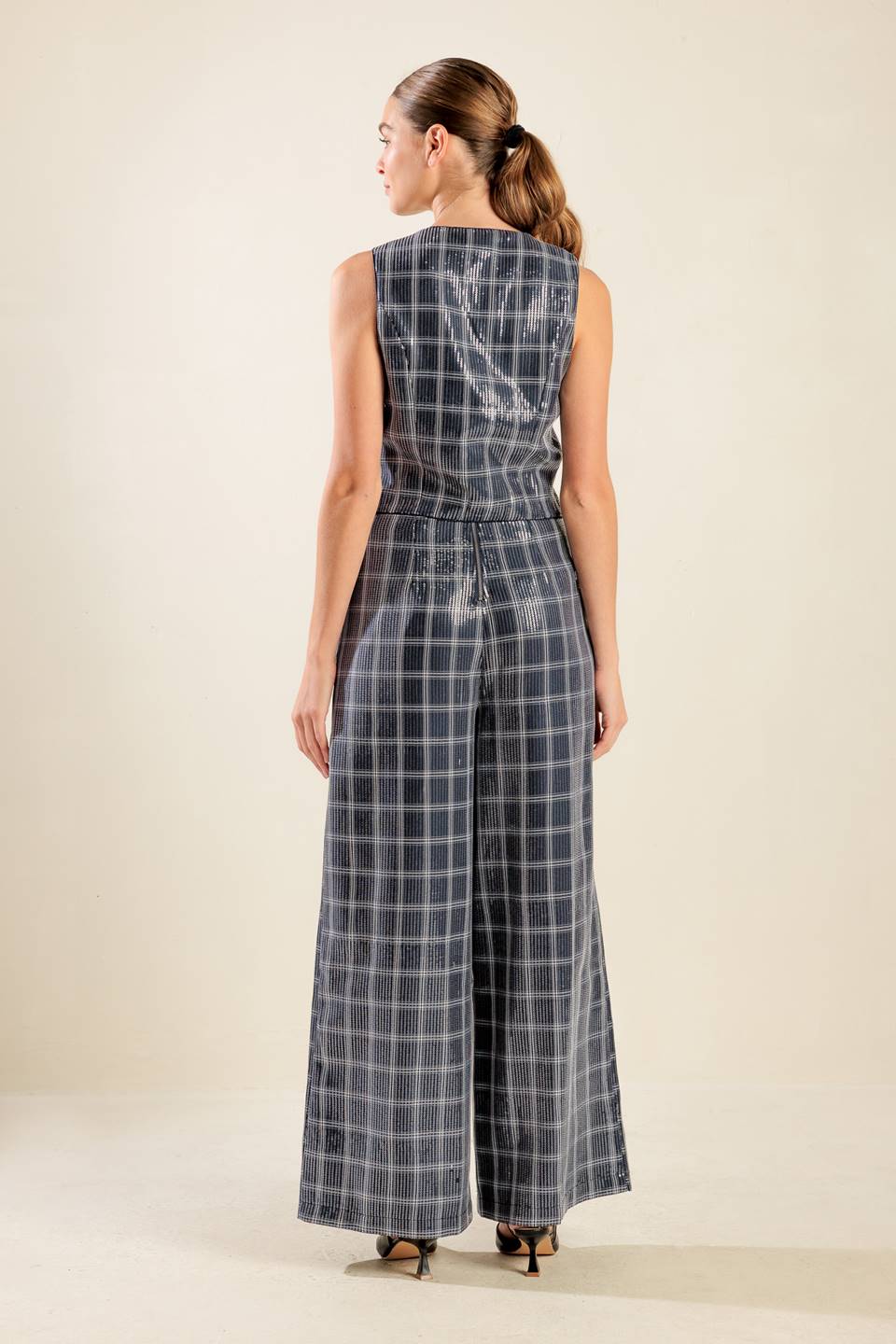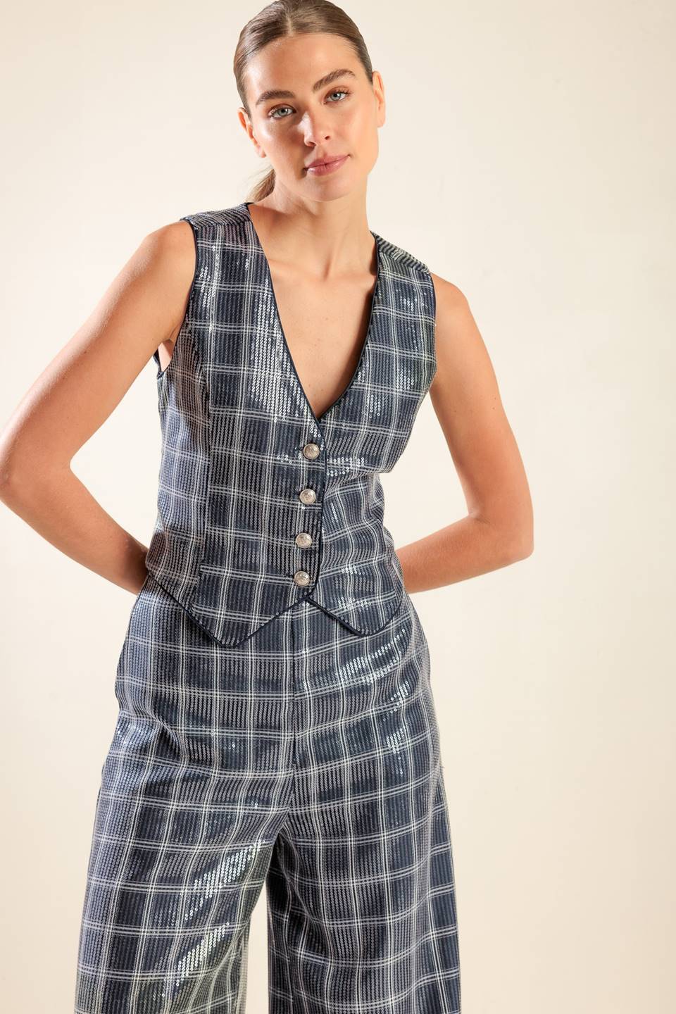 A sequin pant featuring front closure, side pocket and wide leg. Matching vest