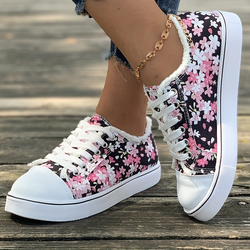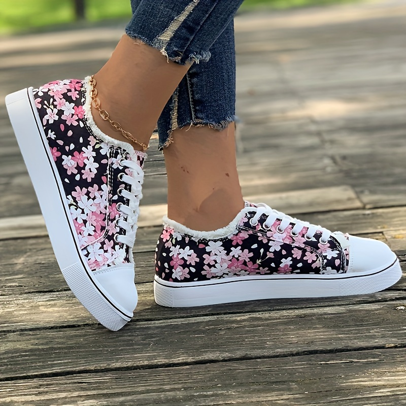 Women's Casual Sakura Floral Print Low-Top Lace-Up Shoes - Breathable Fabric Upper, PU Sole, Round Toe Design for All-Season Comfort & Casual Attire, Ladies Casual Shoes