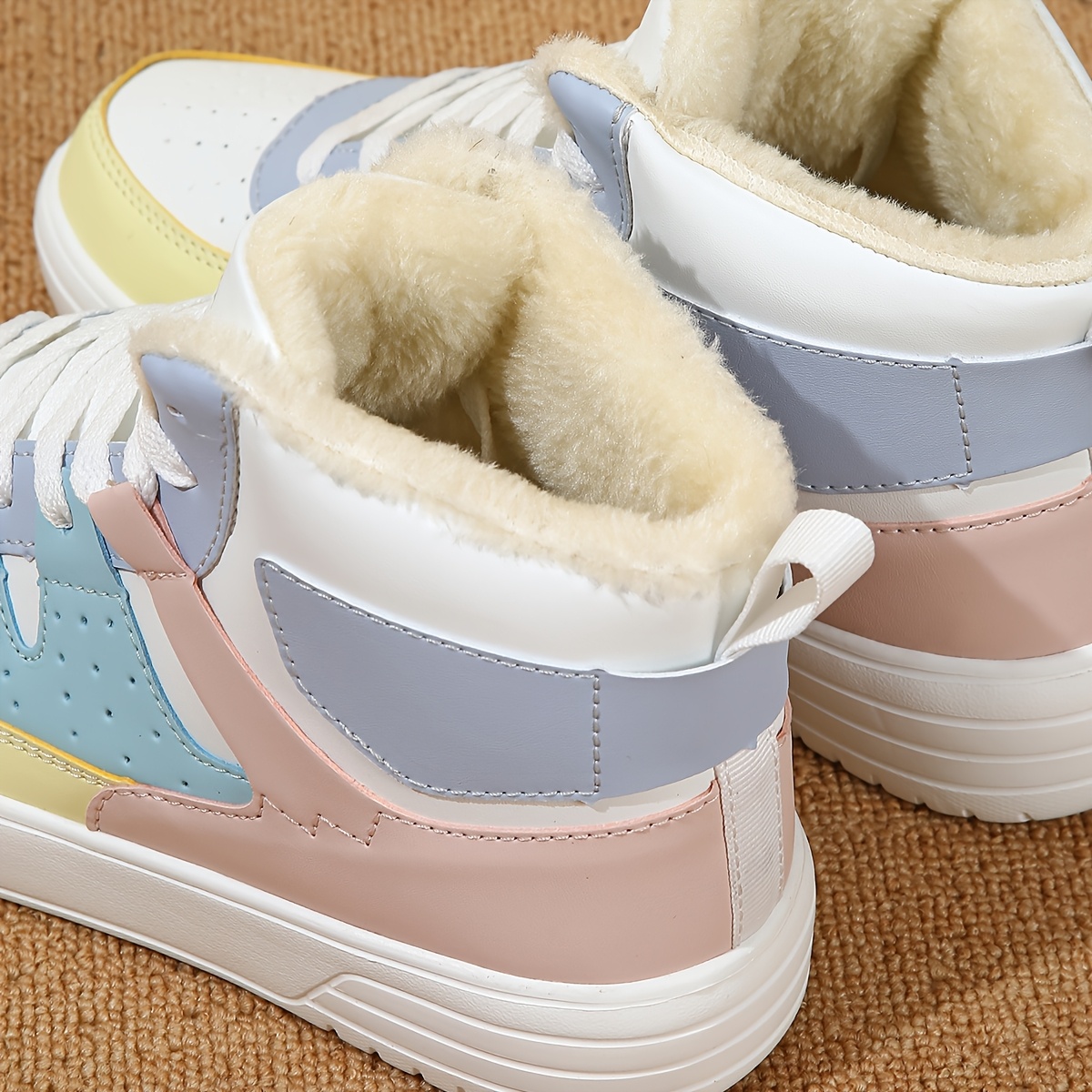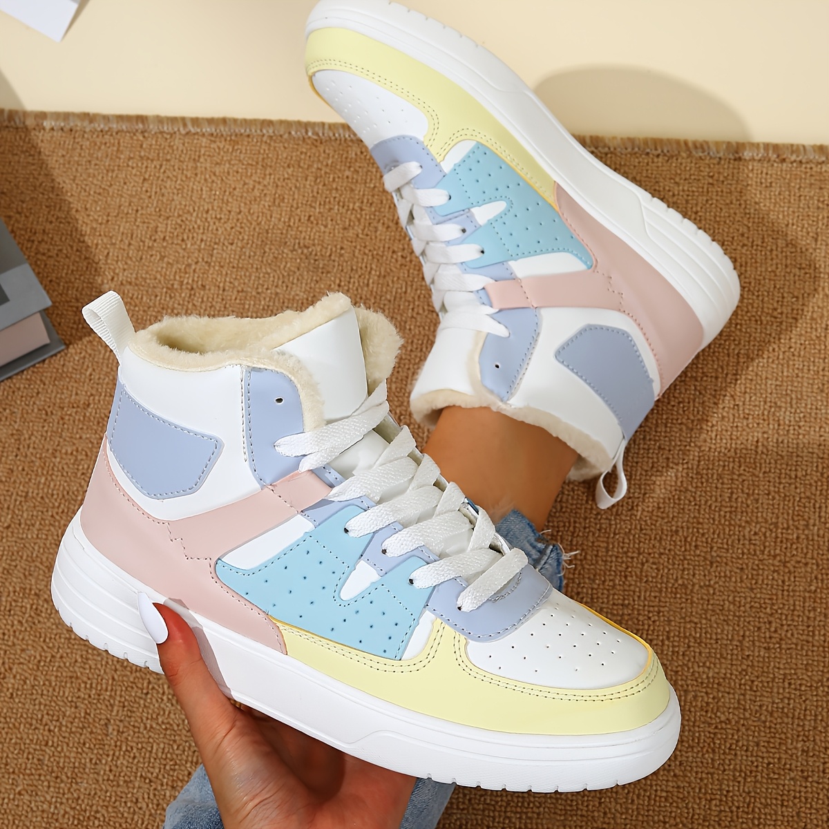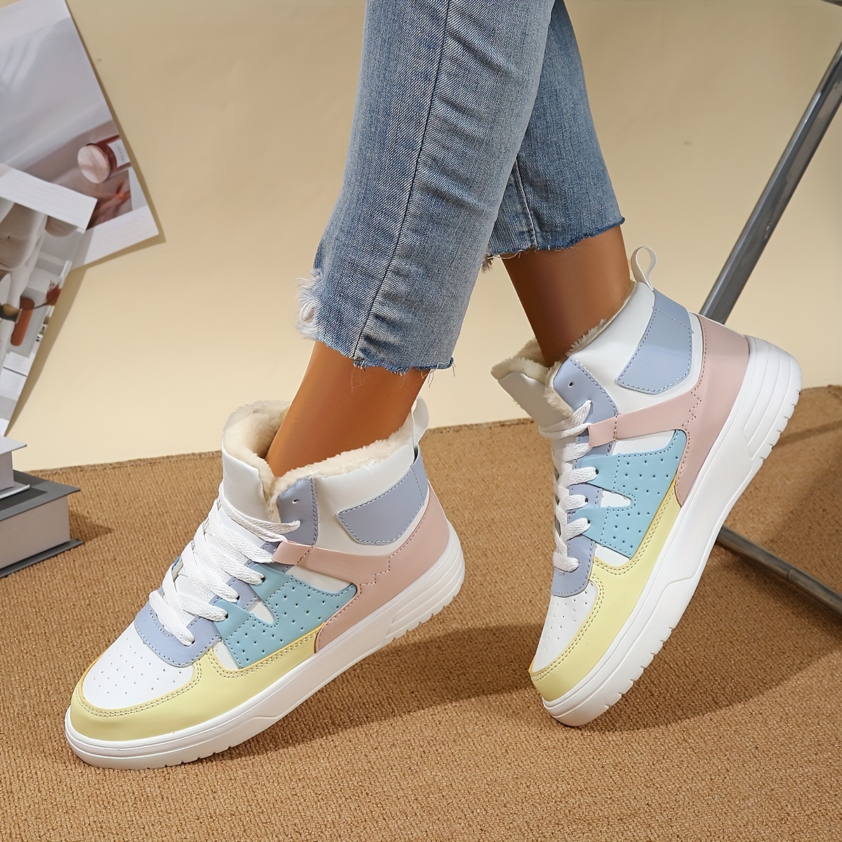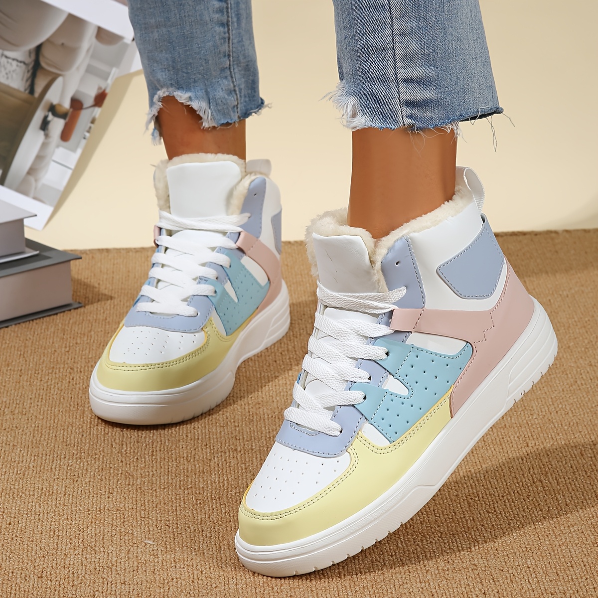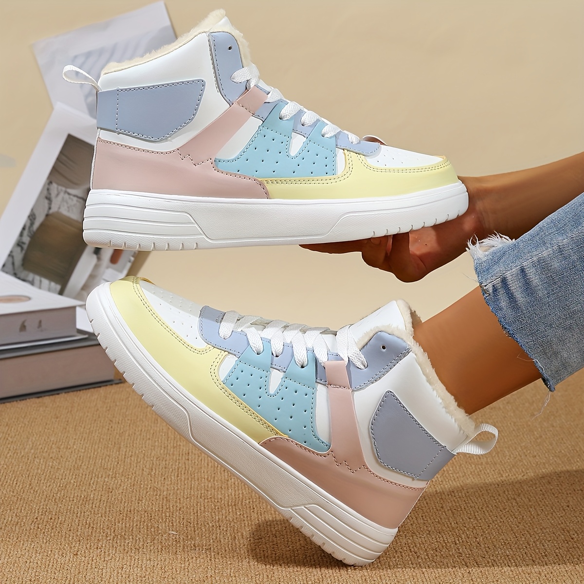 Women's High-Top Sneakers - Pastel Blue, White & Beige Lace-Up Shoes with Cushioned EVA Sole, Soft Synthetic Upper - All-Season Everyday & Formal Footwear - Non-Slip Cushioned Support for Women - Modern Sneakers, Comfortable