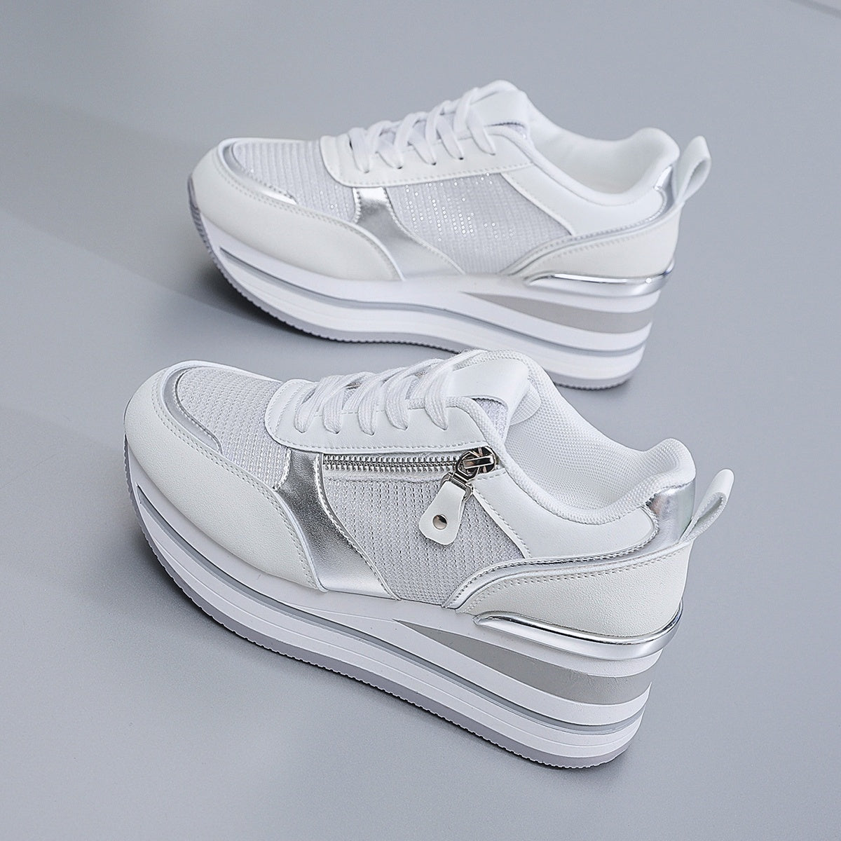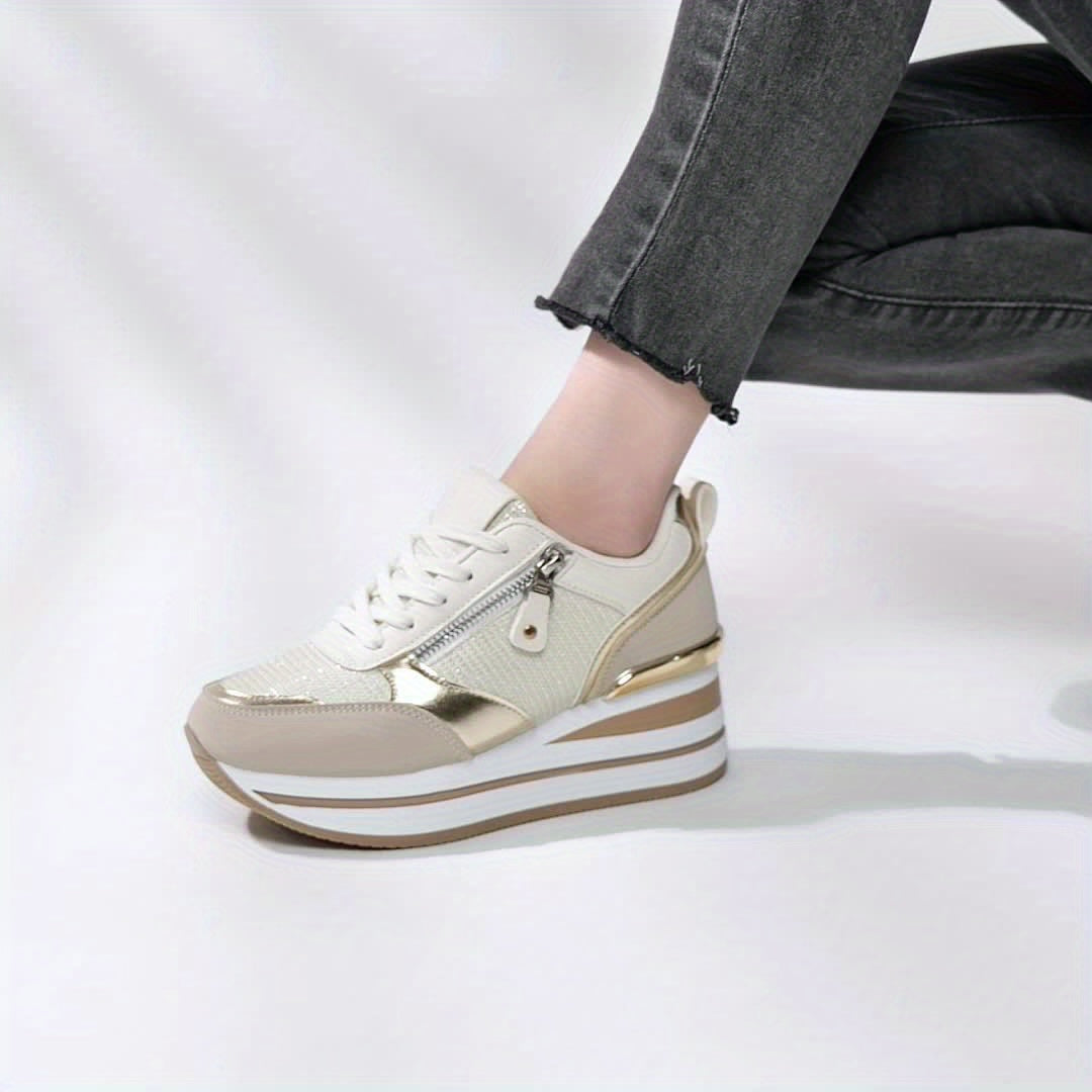 Women's Thick-Soled Elevated Lace-up Sports Shoes | Lightweight, Durable, Non-slip, Fashionable Casual Footwear, All-season, Solid Color, Polyurethane Upper and Insole, Fabric Inner, PVC Sole