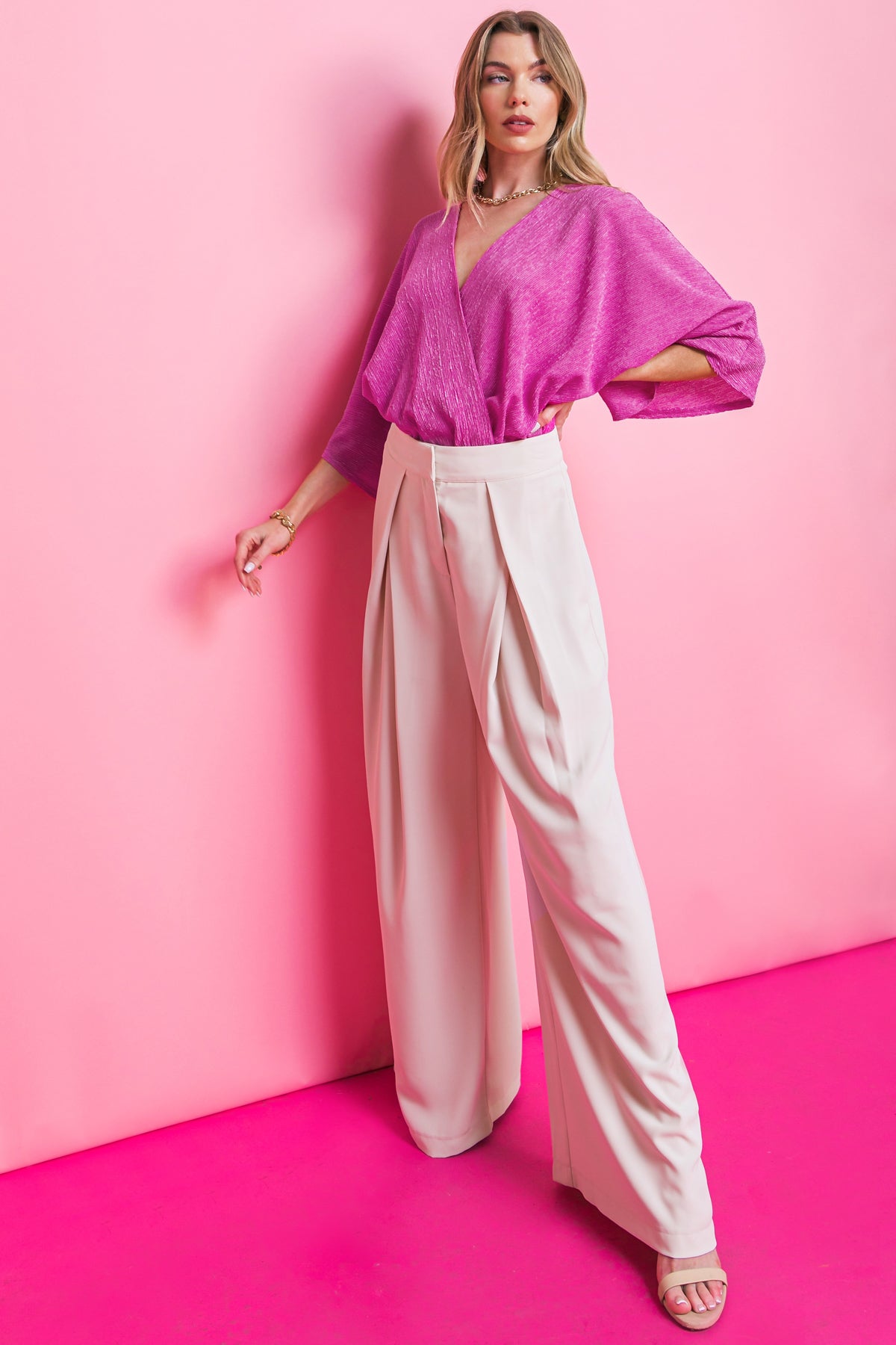 The YOU'RE LUCKY WOVEN TOP offers a versatile cross-over top design with unique texture and breathability. The top is crafted from a smooth, textured woven fabric with a surplice neckline, kimono sleeve and mesh bikini with bottom snap closure. Perfect for a range of occasions, this top is sure to become a wardrobe staple.